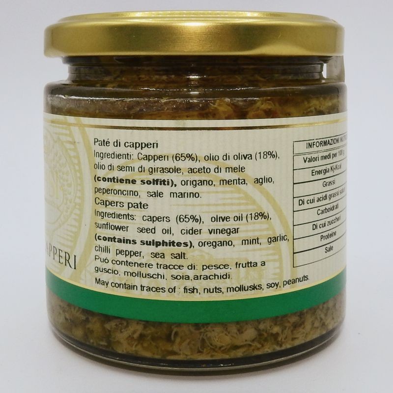 Realizzato con solo capperi siciliani è già pronto per essere usato ed essere abbinato alle carni arrosto, alle carni alla brace, su fette di pane caldo e per condire un’insalata di pomodori insieme all’olio extravergine d’oliva. Il paté di capperi è ideale anche come condimento per insaporire primi piatti di pasta dall’inconfondibile gusto e profumo mediterraneo.